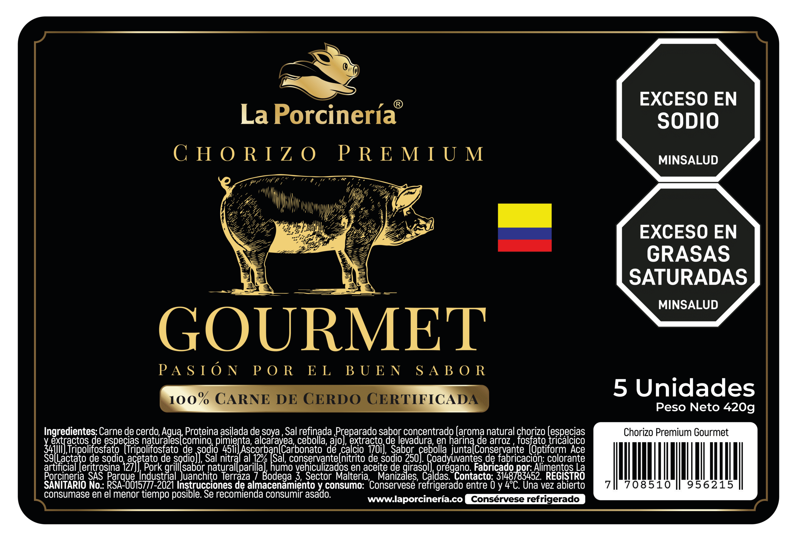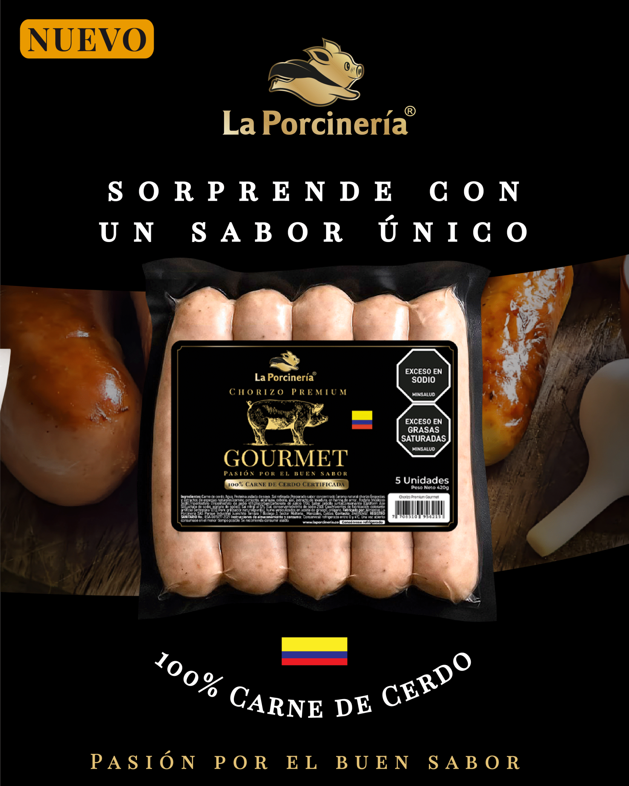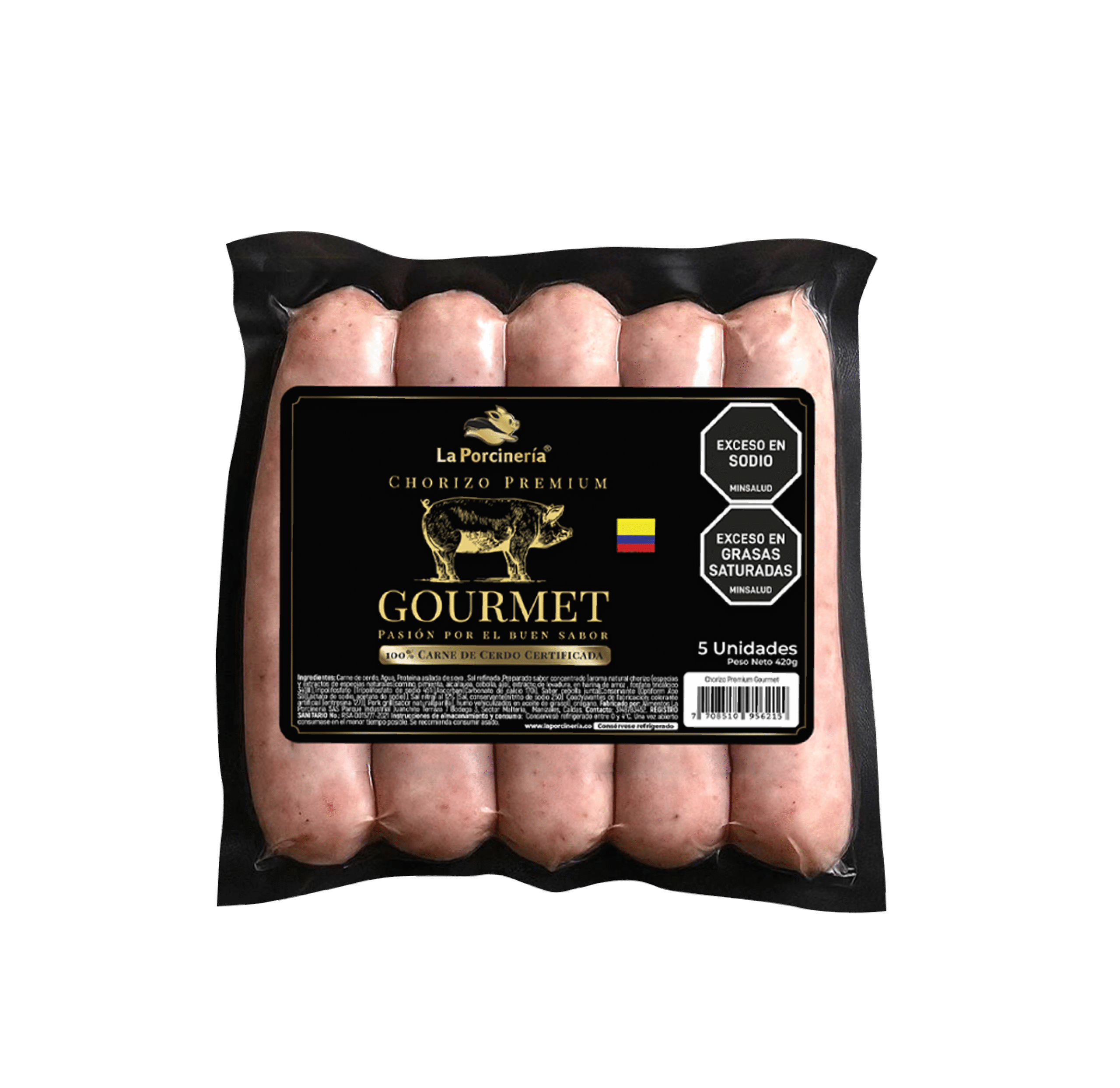 Chorizo premium gourmet de cerdo con especias tradicionales. Métodos de cocción: asar, freír, hervir.